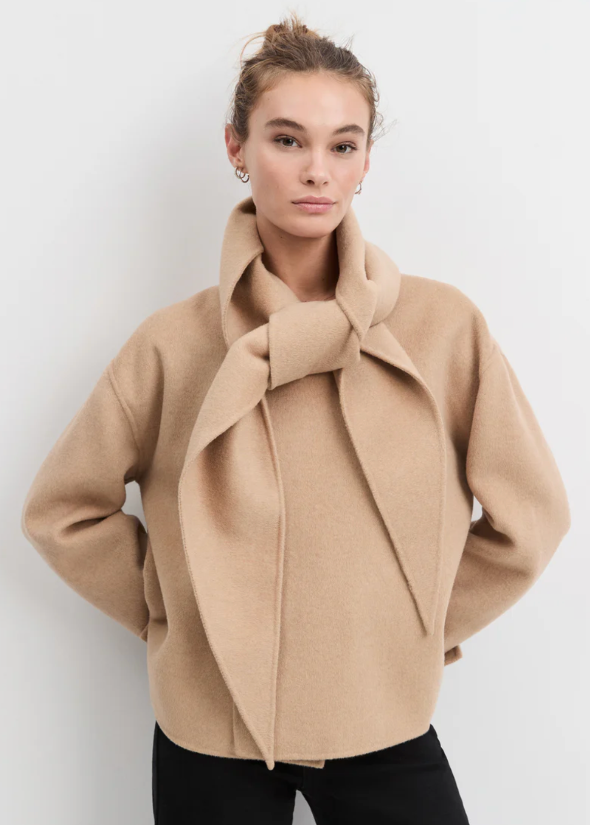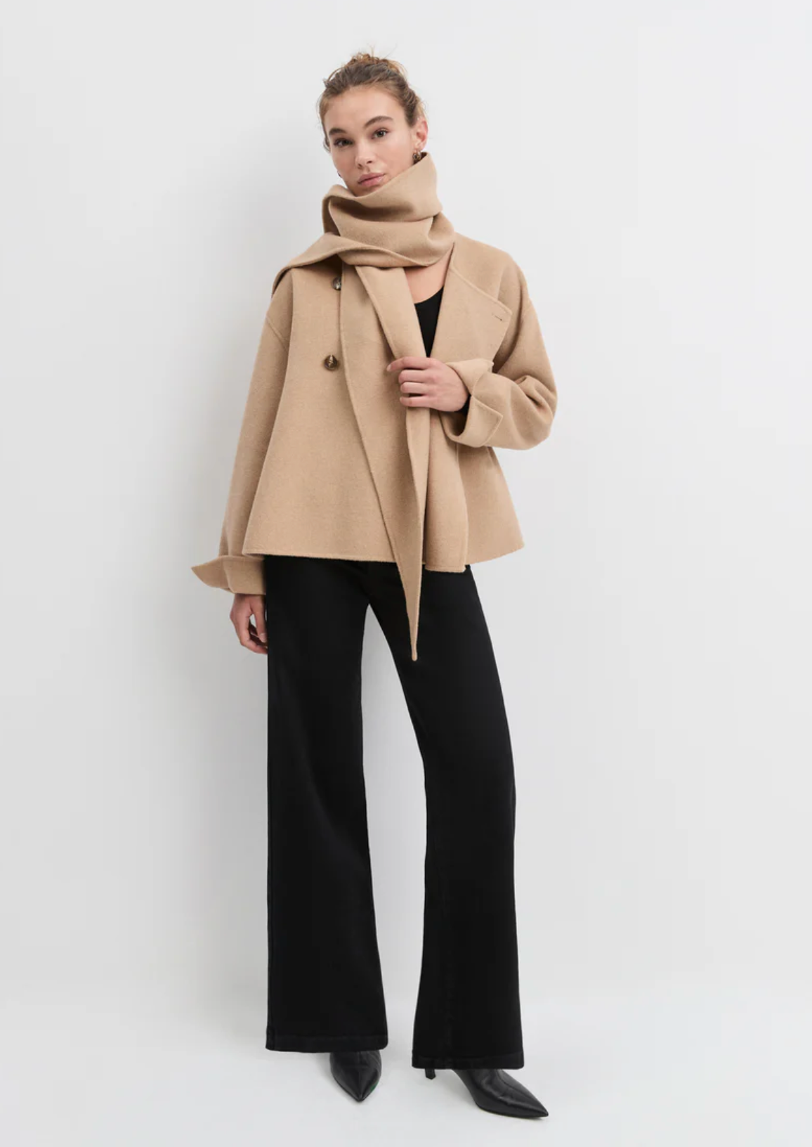 The Jamie Coat is a cold-weather favorite inspired by our best-selling sweater. Double-faced wool, double-breasted front, swingy shape, and a detachable scarf that feels like a built-in accessory.