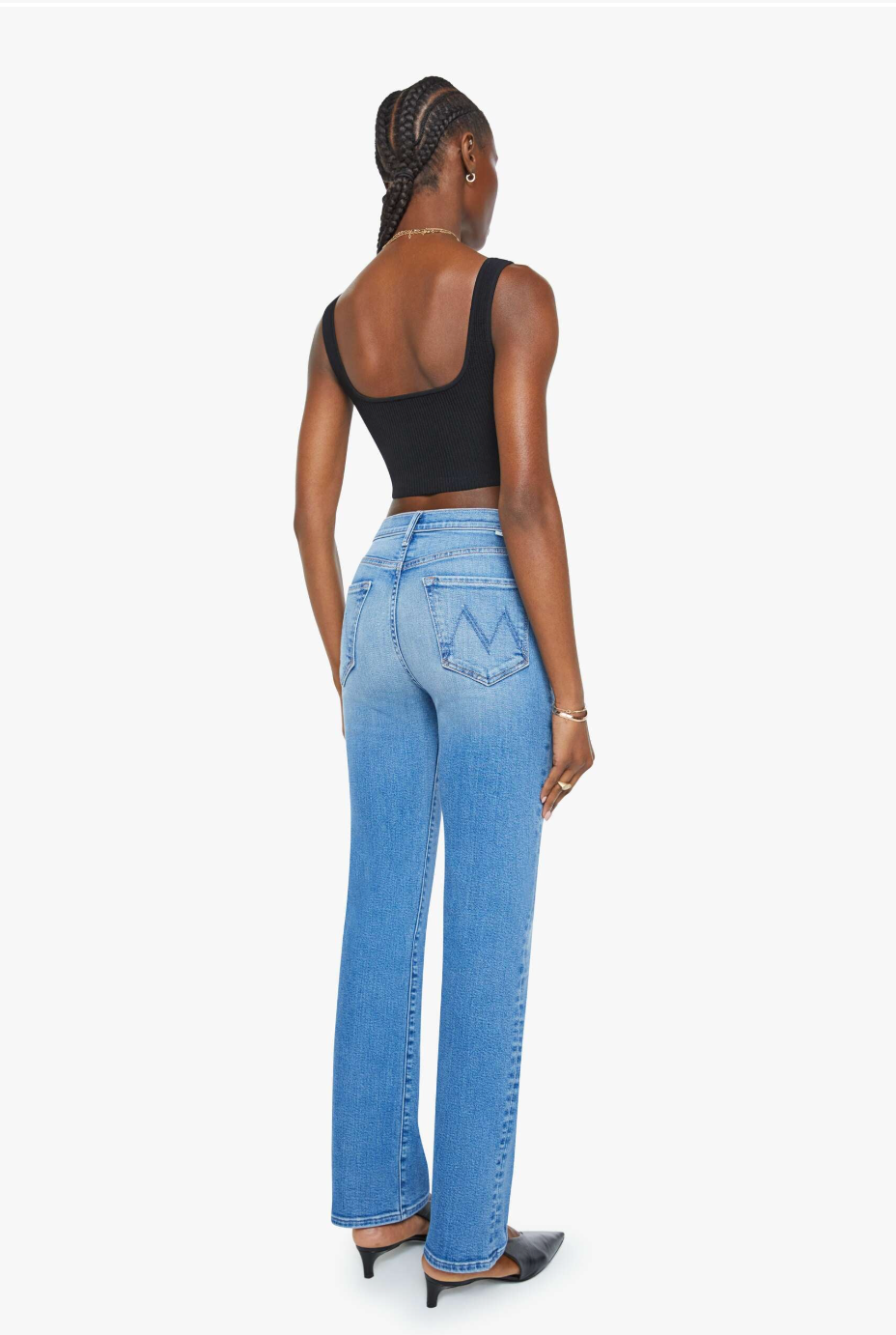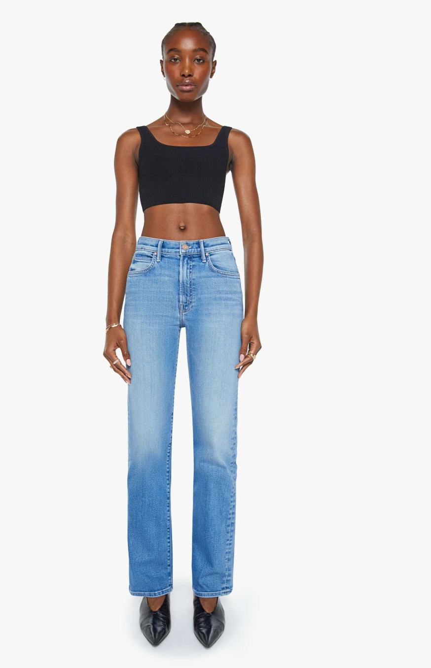 Crowd pleaser. A high-rise straight leg jean with a 32-inch inseam and a clean hem. Cut from stretch denim, Fan Favorite is a mid-blue with whiskering and fading at the knee.