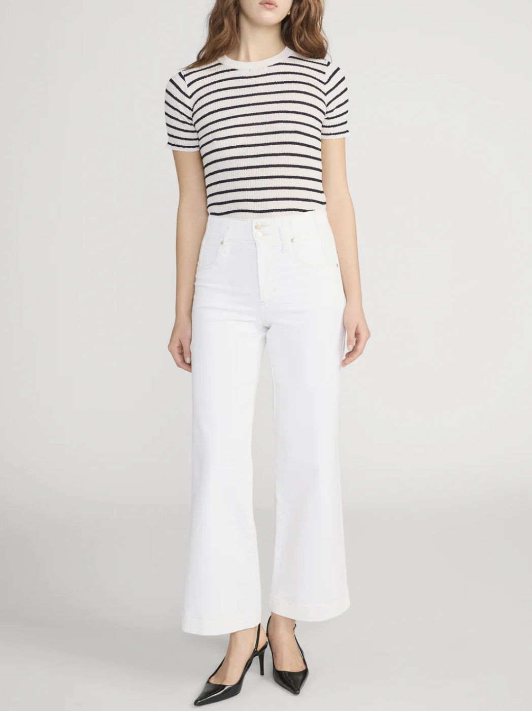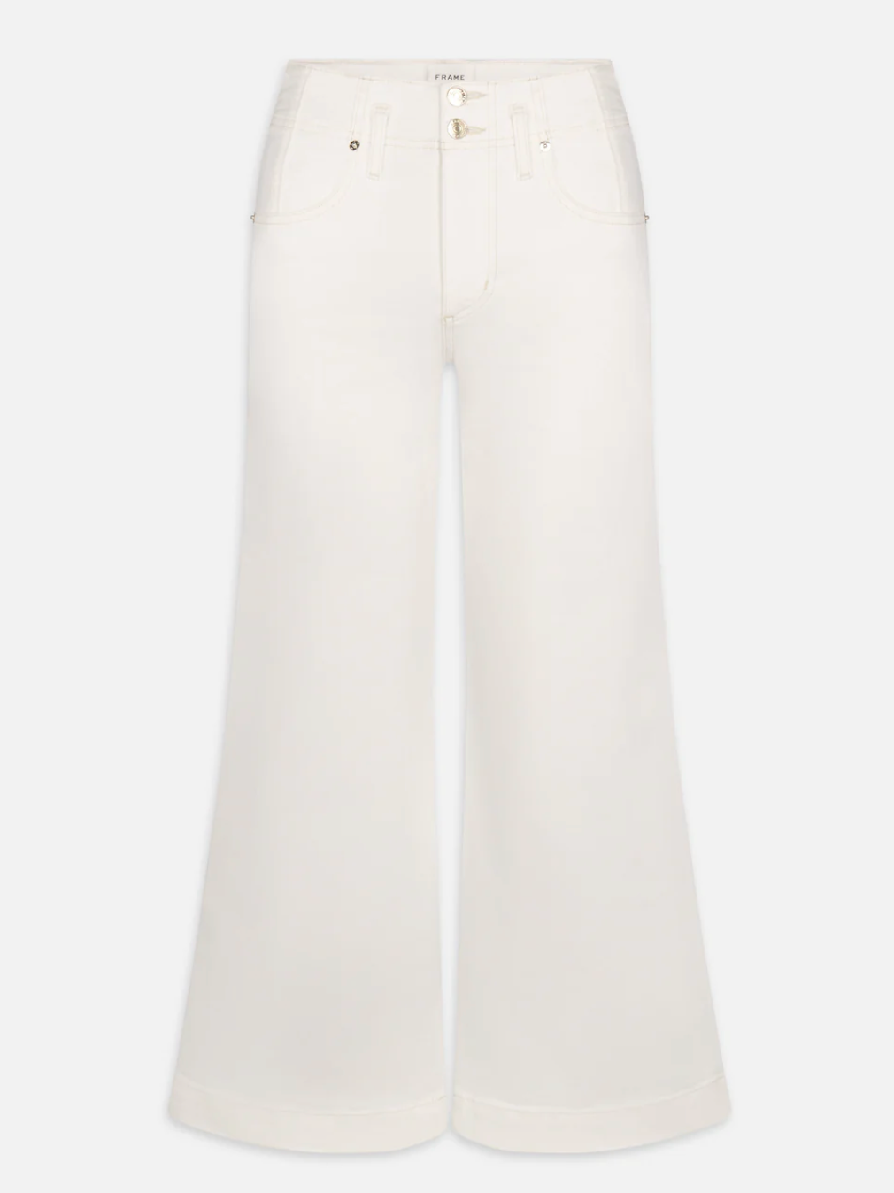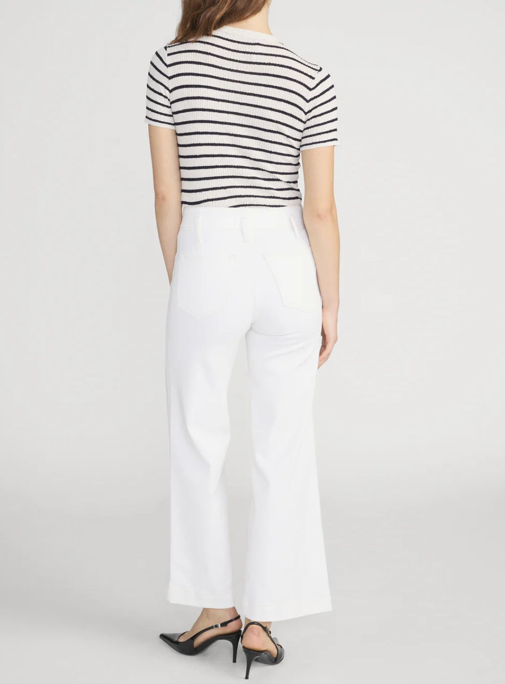 Crafted in super-stretch denim, this cropped trouser silhouette has a flattering high-rise waist, subtle contrast stitching and vertical pocket seams. Finished with a vintage-inspired double-button closure.