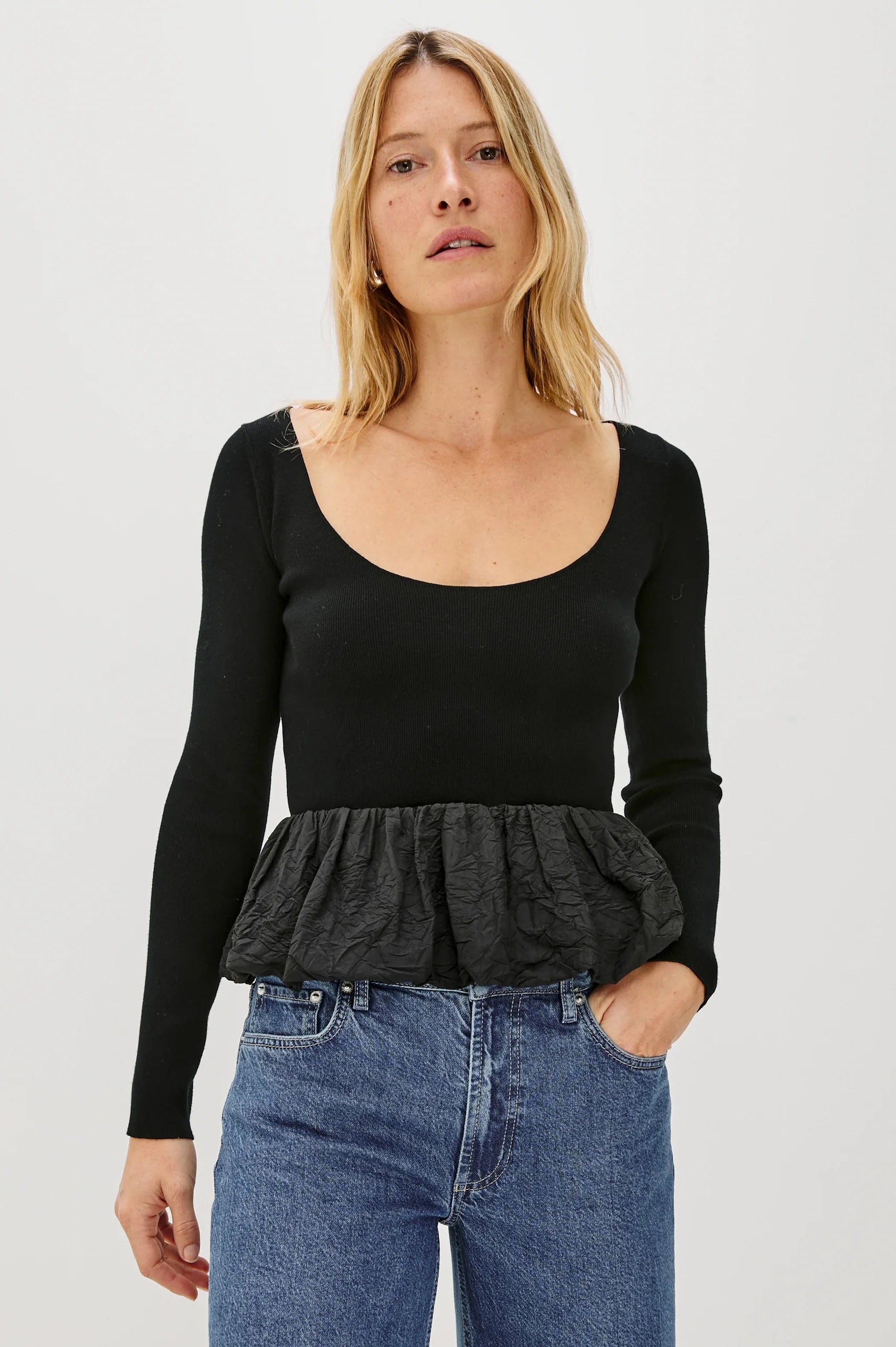The Tillie is a fitted, long-sleeved sweater top crafted in a fine-gauge knit. A cotton poplin ruffle adds contrast at the hem.